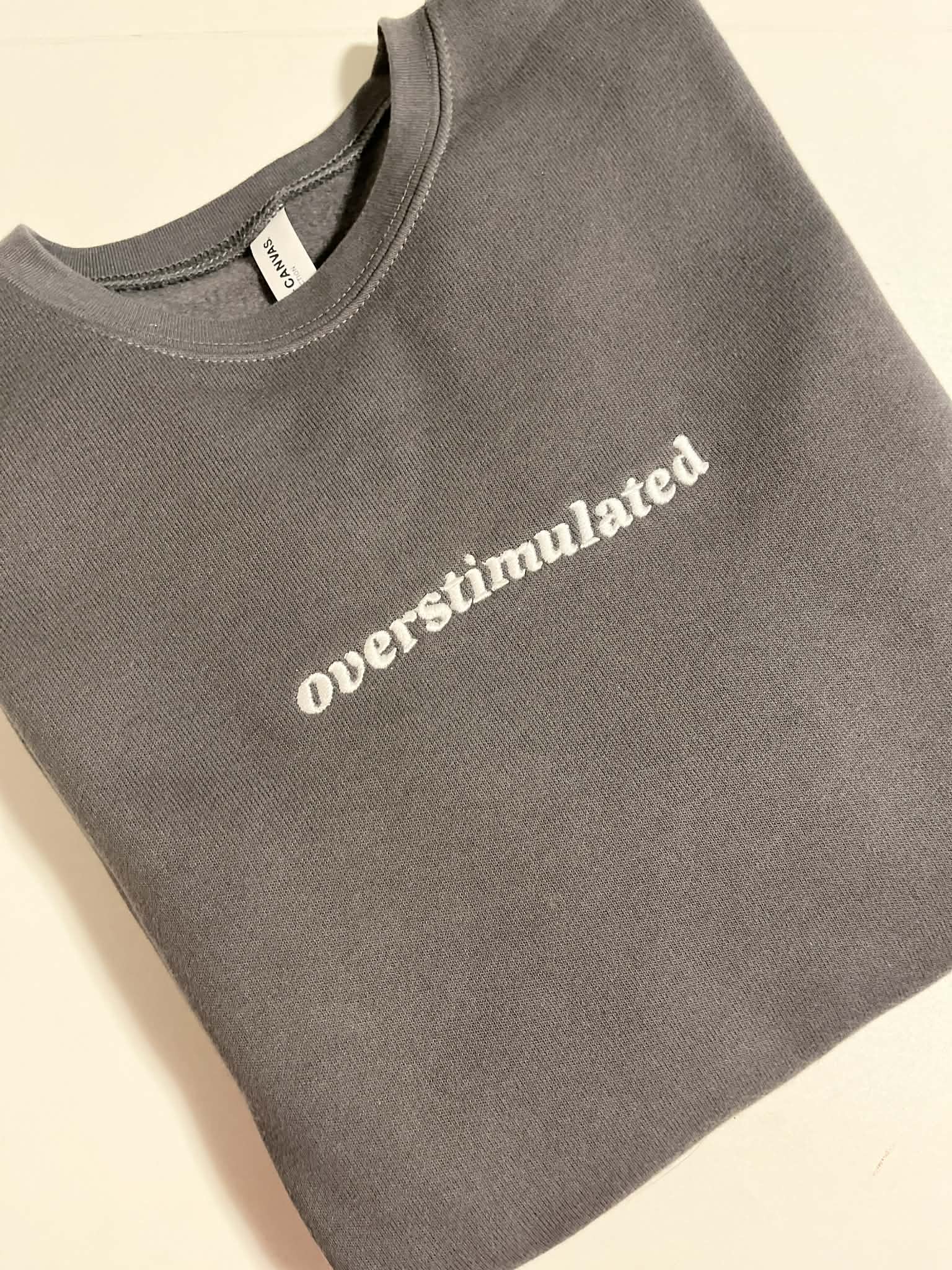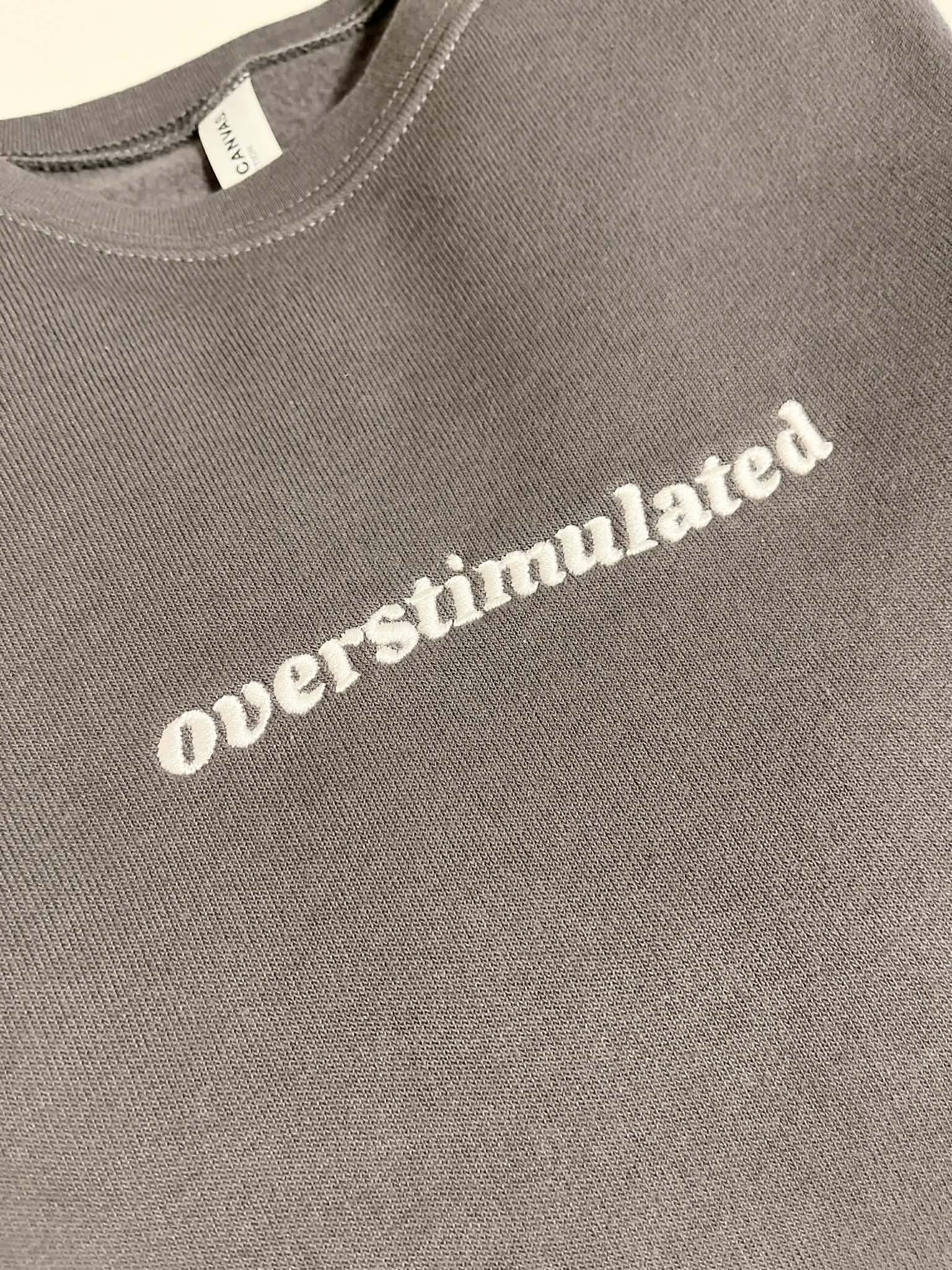 Overstimulated Embroidered Sweatshirt - Dark Grey with White Text