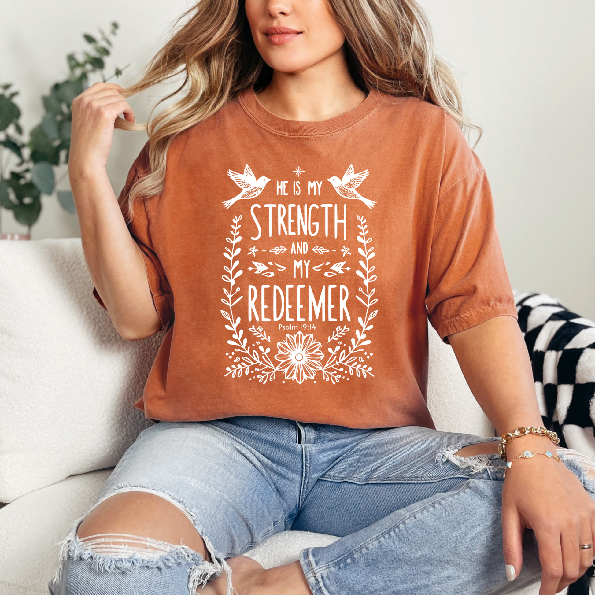 Our "My Strength and My Redeemer" Christian T-Shirt is a bold declaration of faith inspired by Psalm 19:14. This empowering design highlights God's role as your ultimate strength and redeemer, offering both comfort and encouragement. Crafted from soft, high-quality cotton, this tee is perfect for daily wear or as a meaningful gift for loved ones. Available in various sizes and colors, it’s a stylish way to express your trust in God's support and salvation. Wear it proudly and share the message of divine strength and redemption!